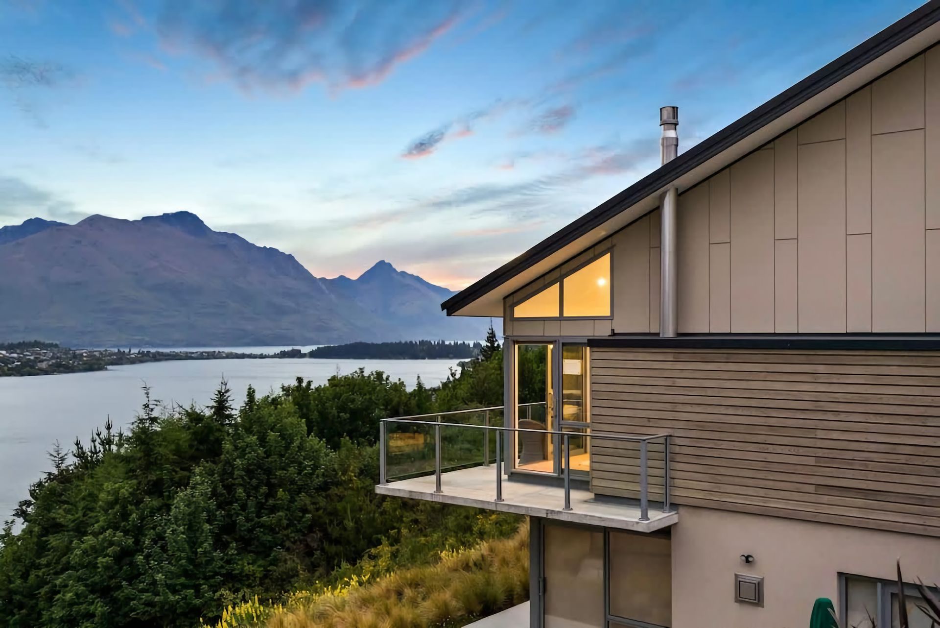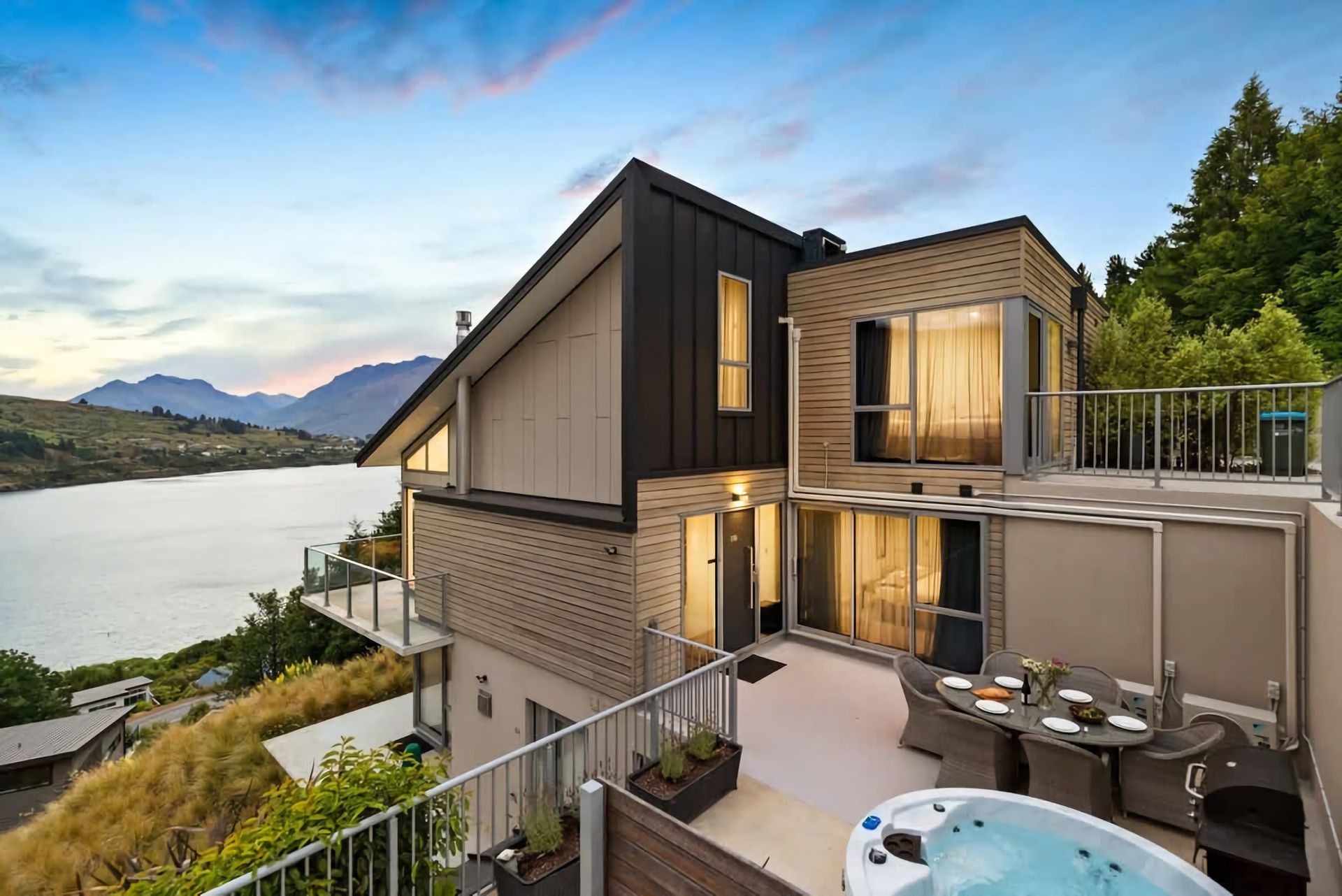 180-degree outlook of the lake and mountains is an ever-changing panorama - Hot tub and Barbeque on the terrace overlooking the lake - 5 minute drive to the centre of Queenstown - 2 minute drive to Frankton - Heating throughout the house to stay warm over the winter - Airconditioning in every room for the warmer months