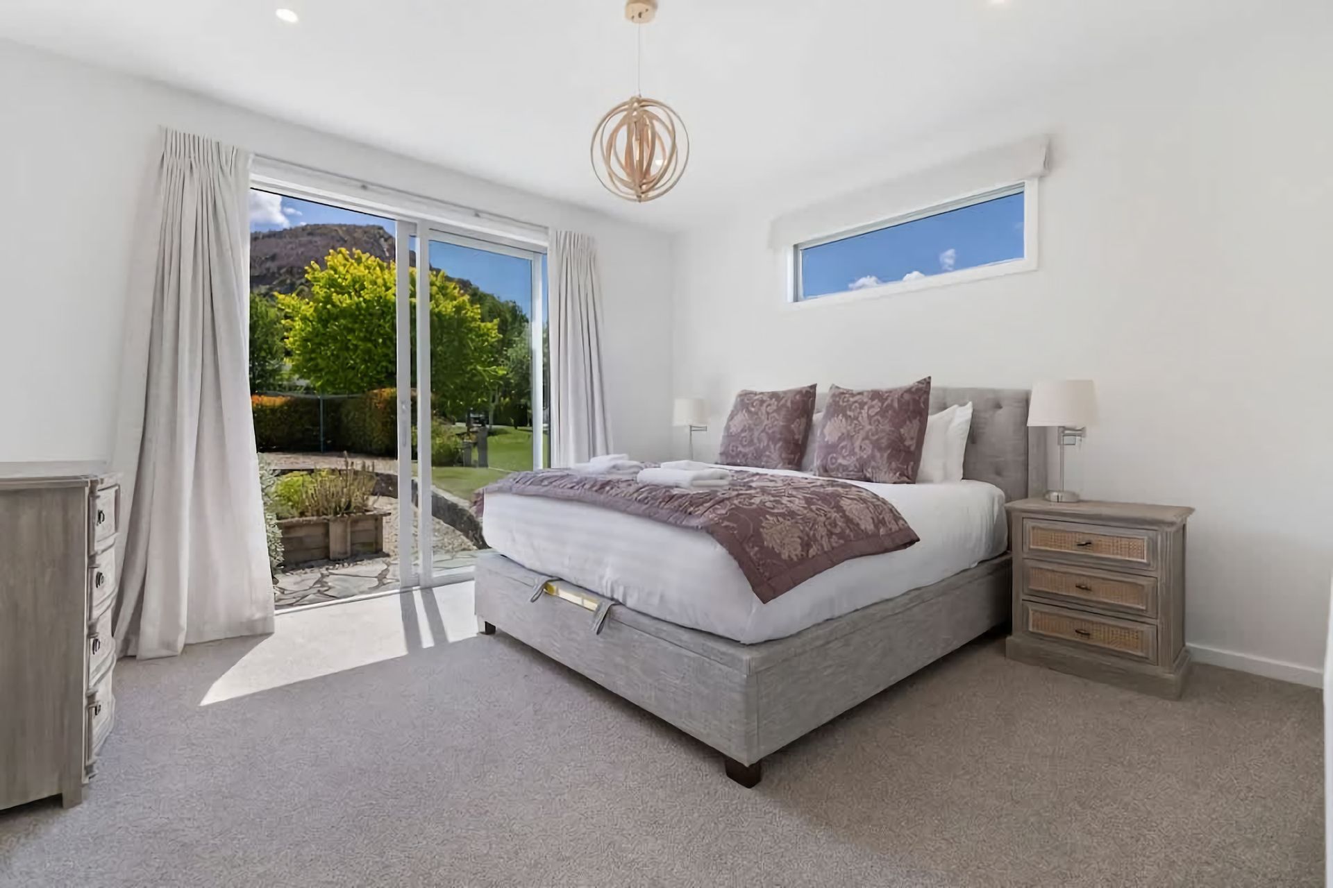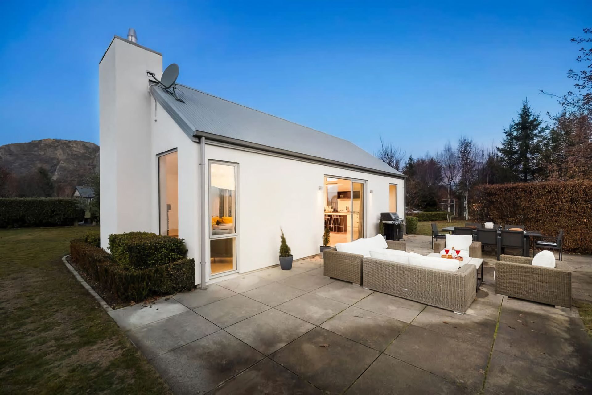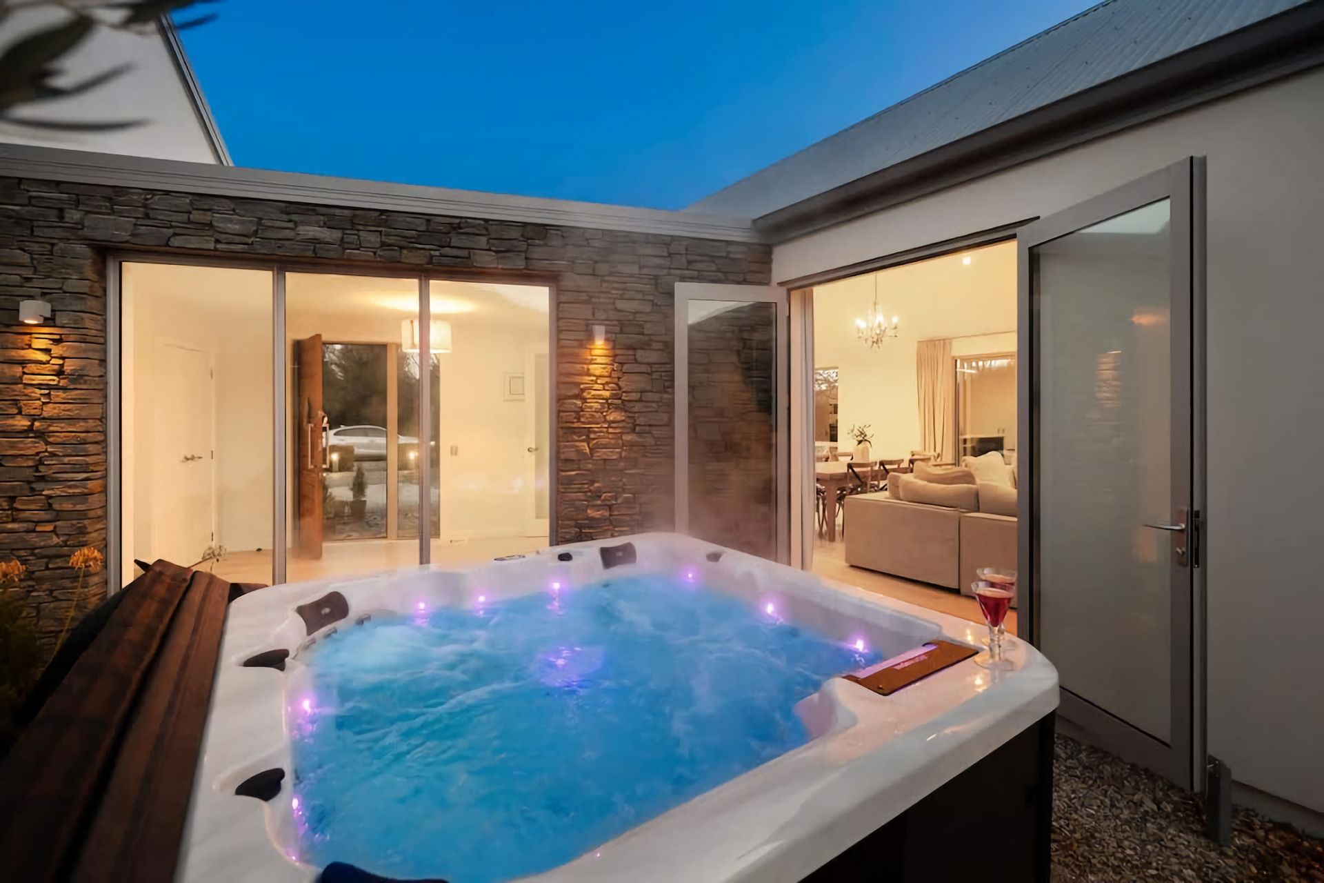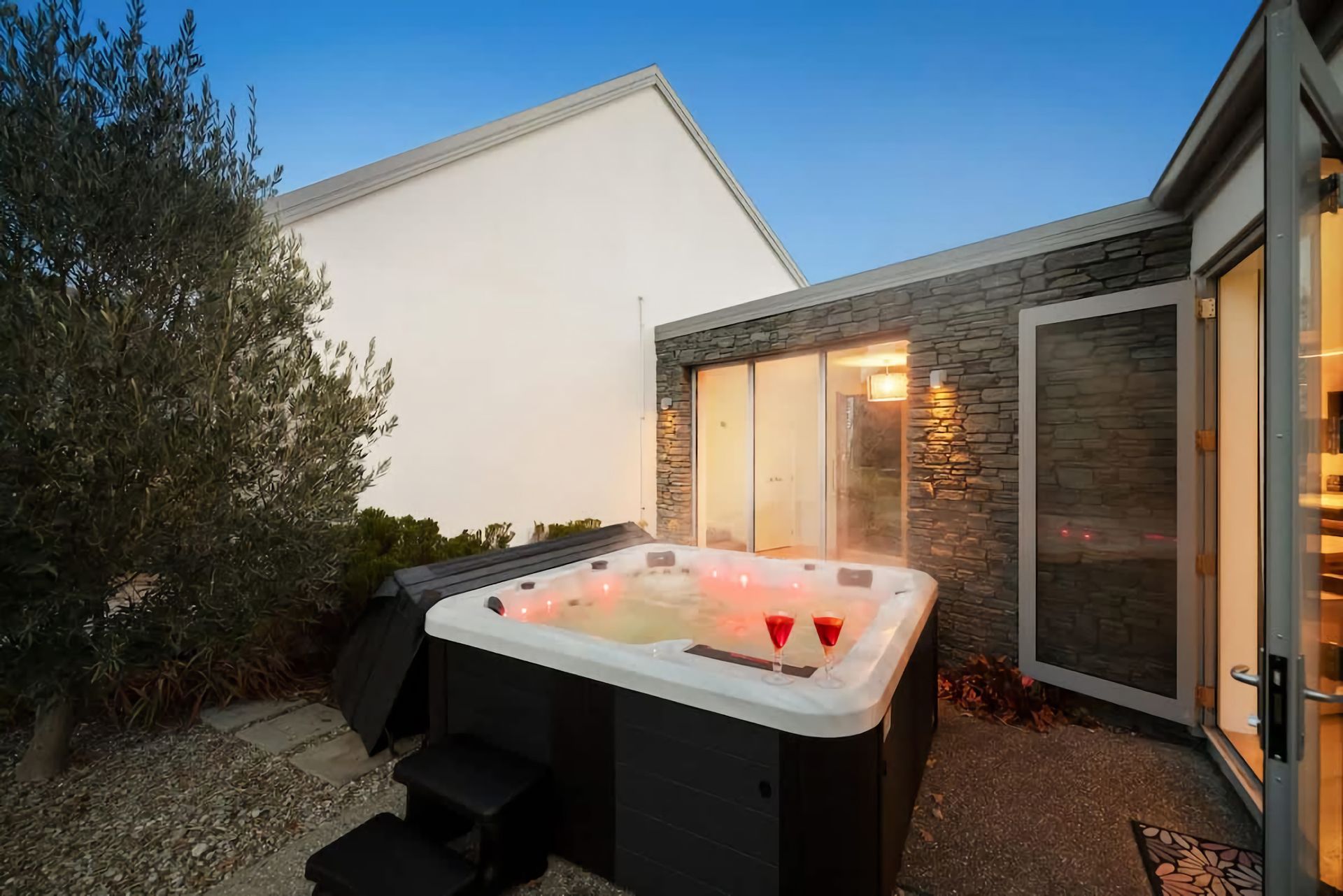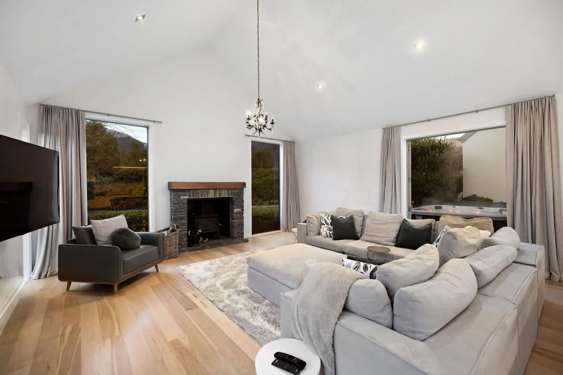 Relax in a comfortable living area with a cozy atmosphere. Large windows bring in natural light and provide views of the surrounding beauty. Enjoy outdoor living in a serene environment. Private garden space for al fresco dining, including a large barbeque or peaceful moments in the hot tub.