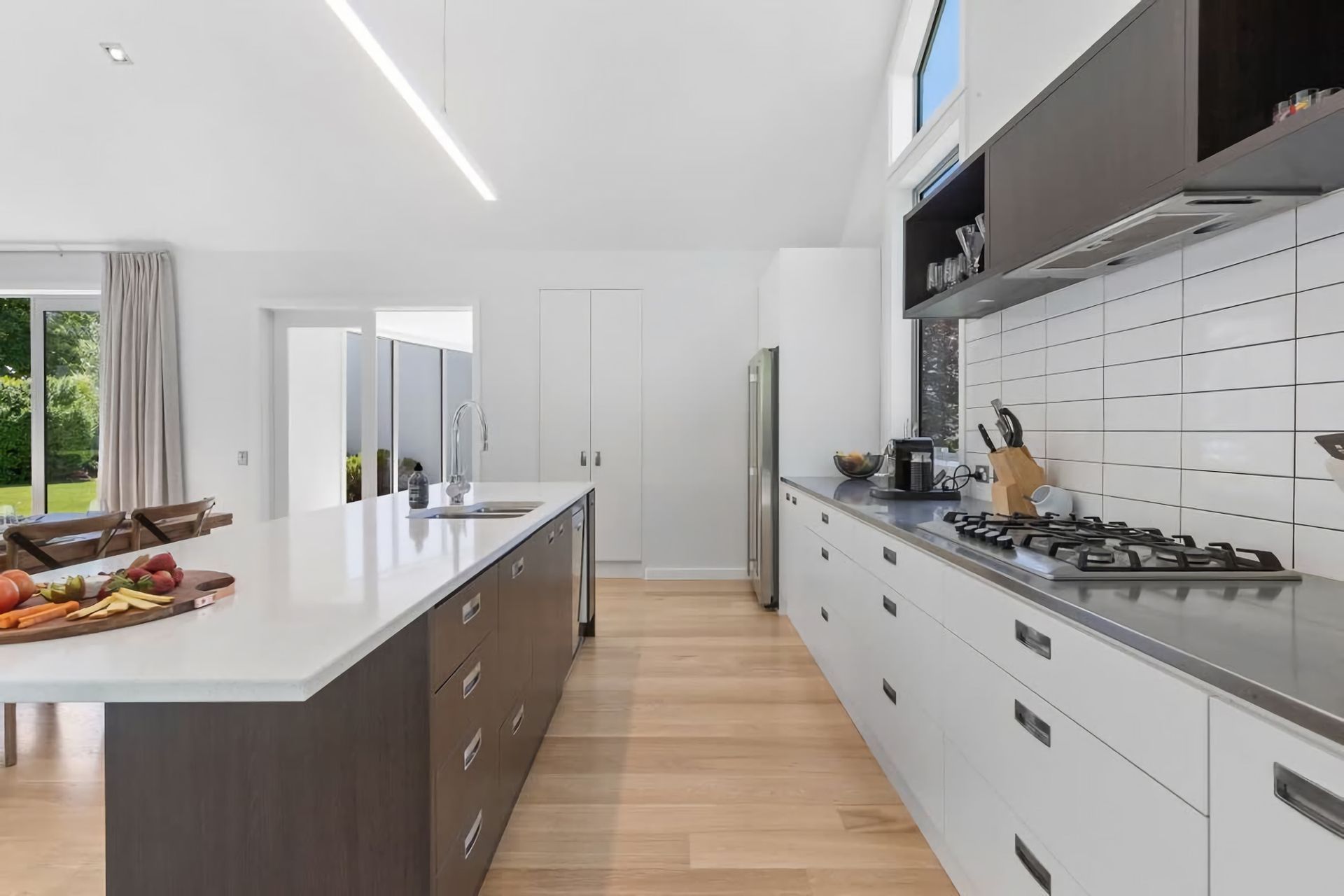 Fully equipped kitchen for culinary enthusiasts. Modern amenities and sleek design make cooking a pleasure. The superbly-appointed kitchen with luxury appliances opens to the dining and living area, making it easy to still mingle amongst your friends and family while preparing meals.