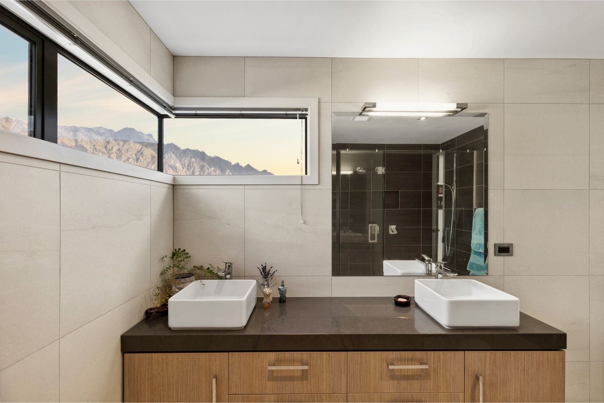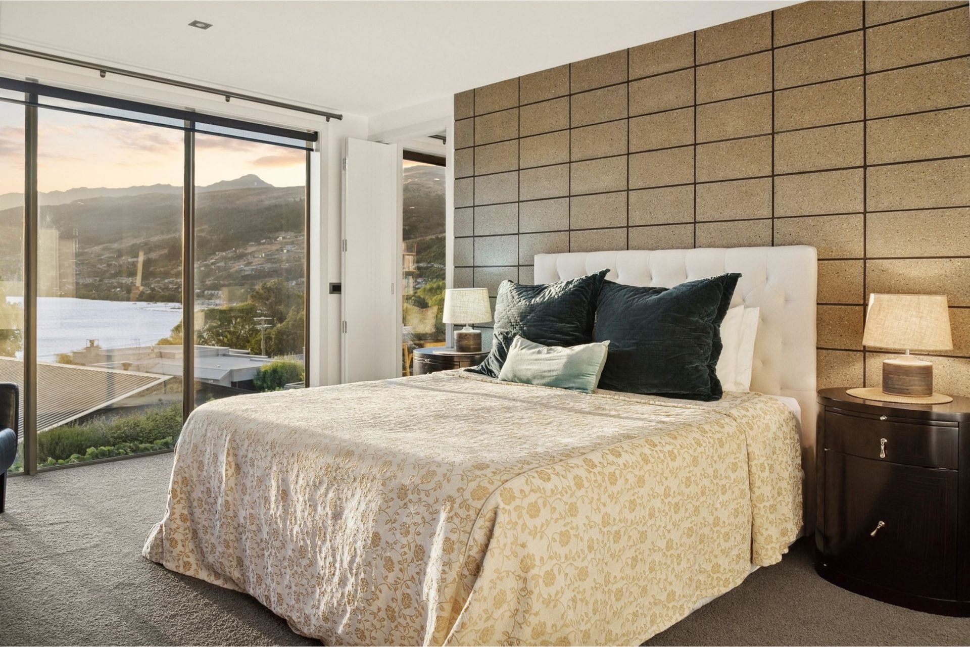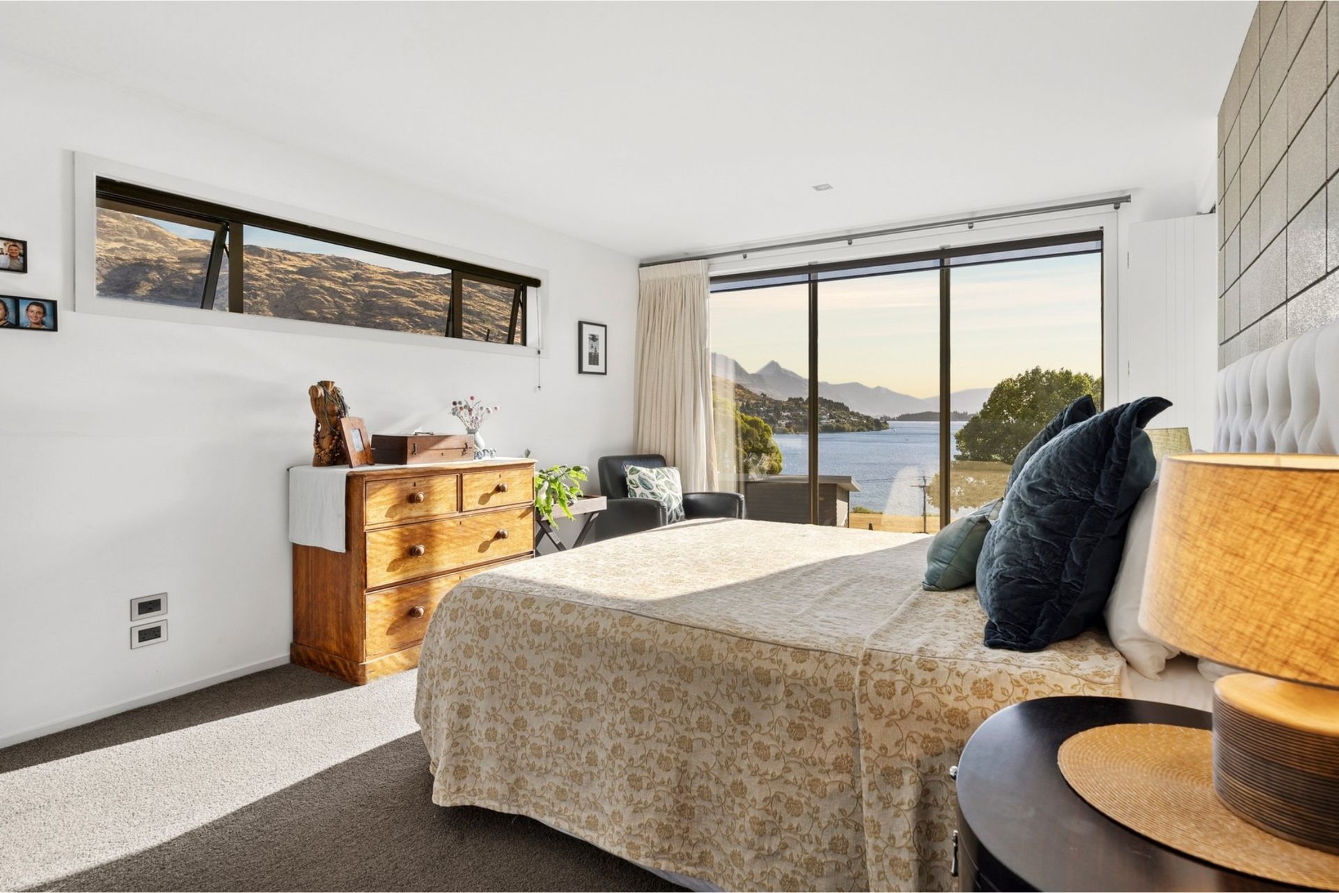 The upper level takes full advantage of the outlook, with floor-to-ceiling windows framing the lake and surrounding mountains. Here you’ll find the master bedroom with ensuite, a second lounge for quiet evenings or movie nights, and a small study nook.