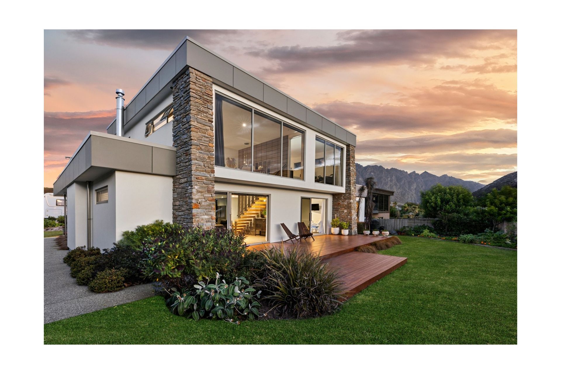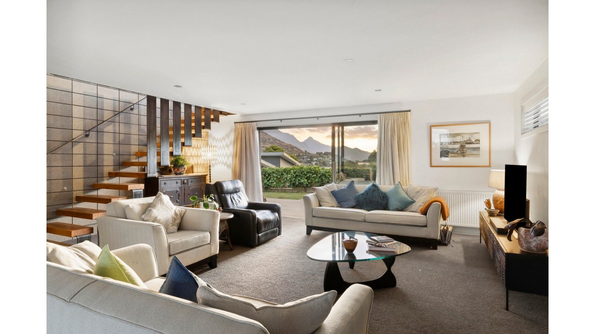 With four bedrooms and two bathrooms spread across two generous levels, the home offers a relaxed, lived-in feel rather than a sterile holiday house. Thoughtfully designed living spaces open out to a private, well-established garden, while upstairs living areas enjoy stunning lake and mountain outlooks — perfect for unwinding after a day of adventure.