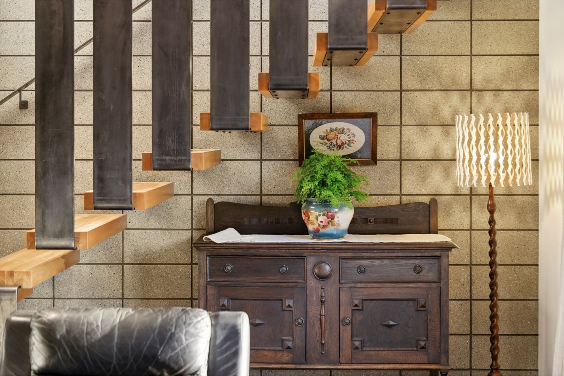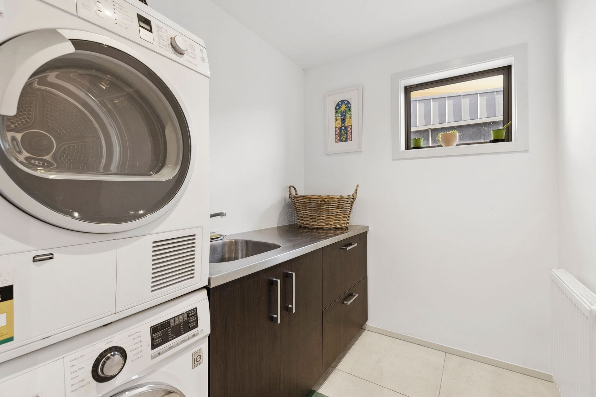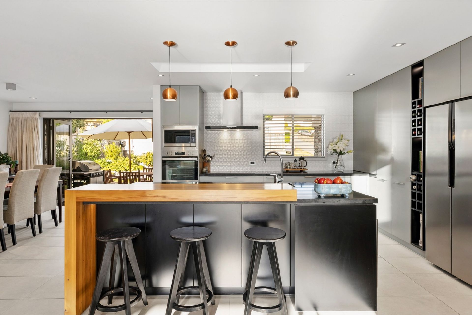 A custom steel and rimu staircase connects the two levels and is a striking architectural feature, though it is not suitable for toddlers.