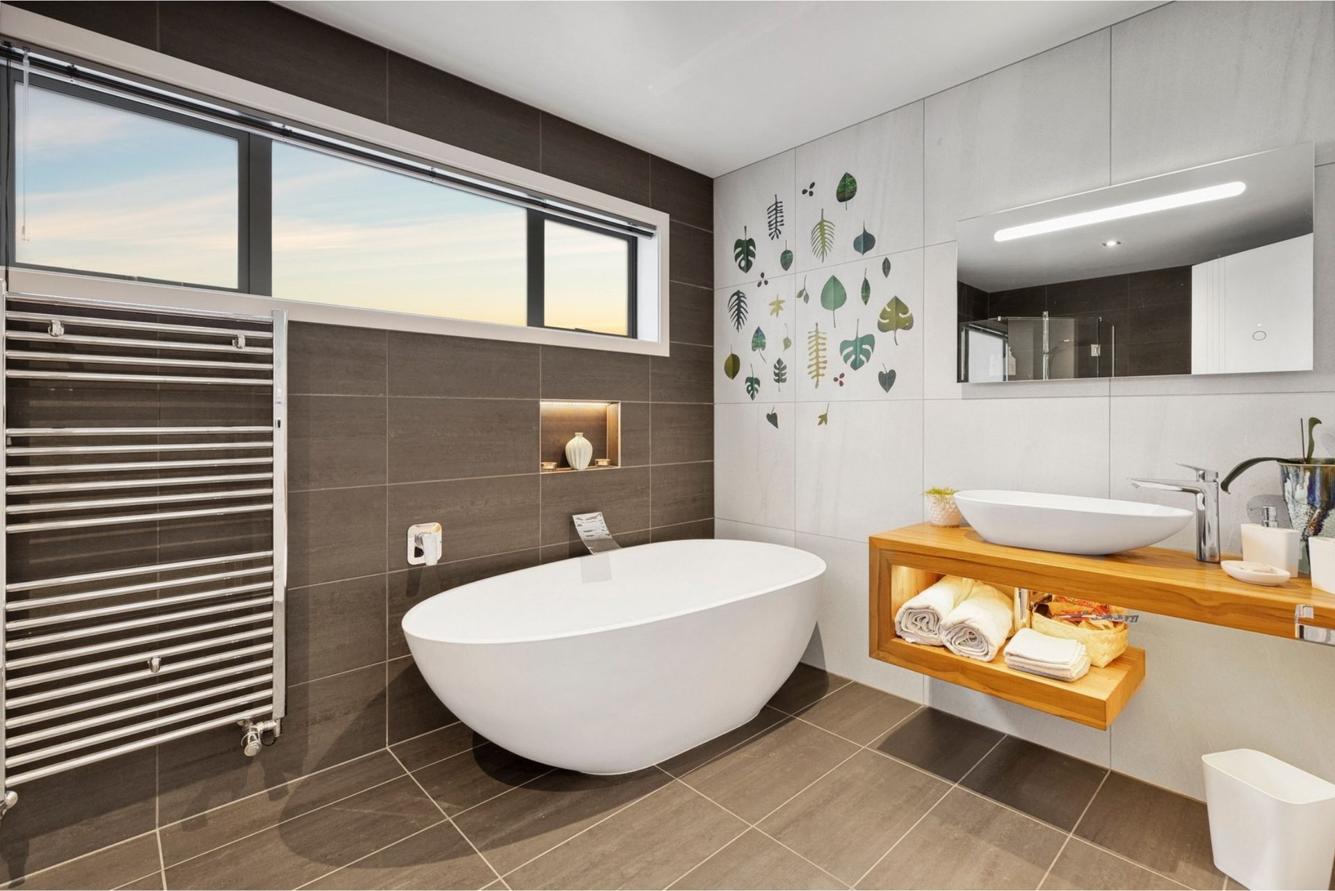 Downstairs is centred around a spacious open-plan kitchen, dining and living area, creating a natural hub for cooking, dining and relaxing together. Large doors connect the living space to the outdoor areas and garden. Also on this level are three bedrooms, a shared high-end bathroom, a separate toilet and a laundry.