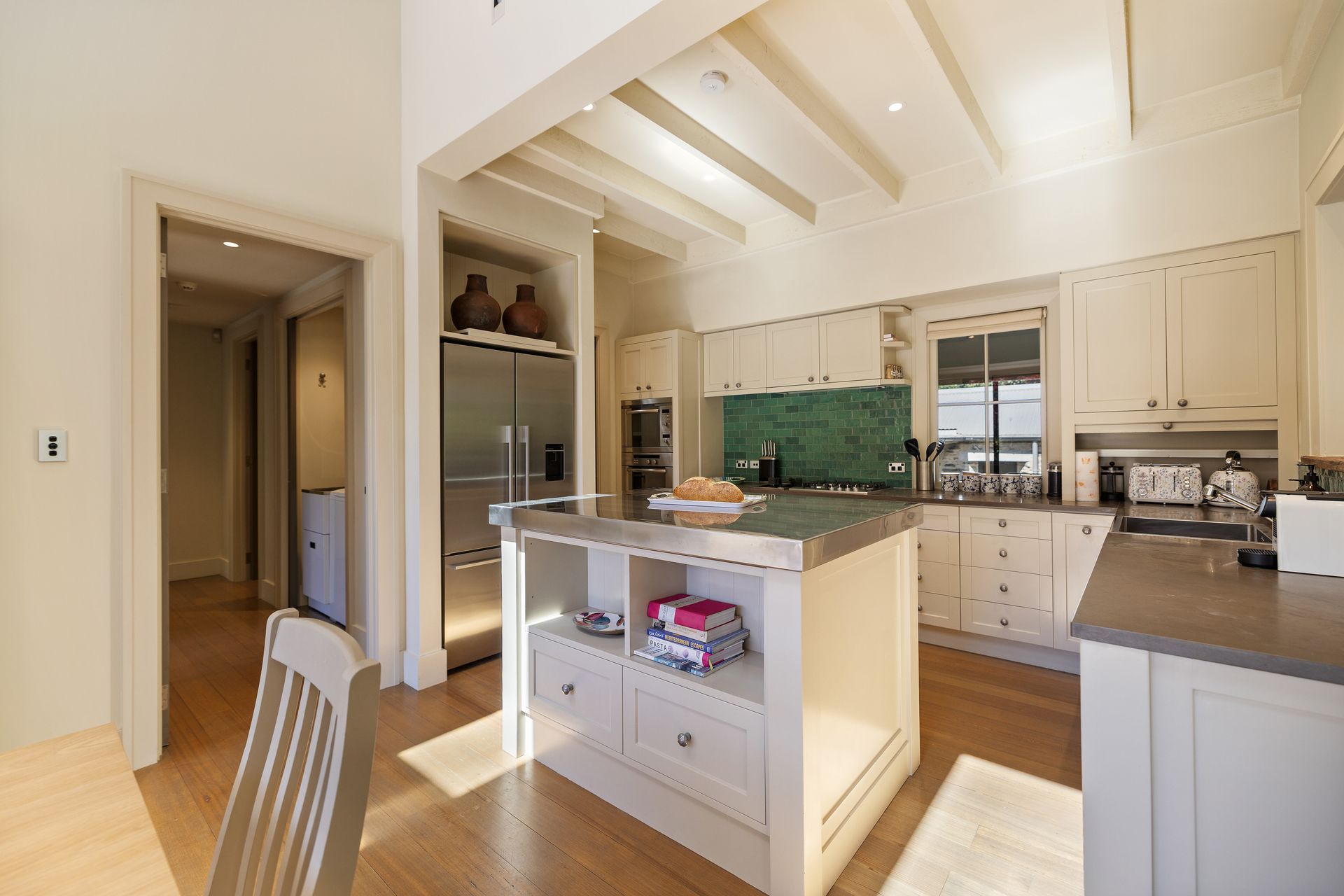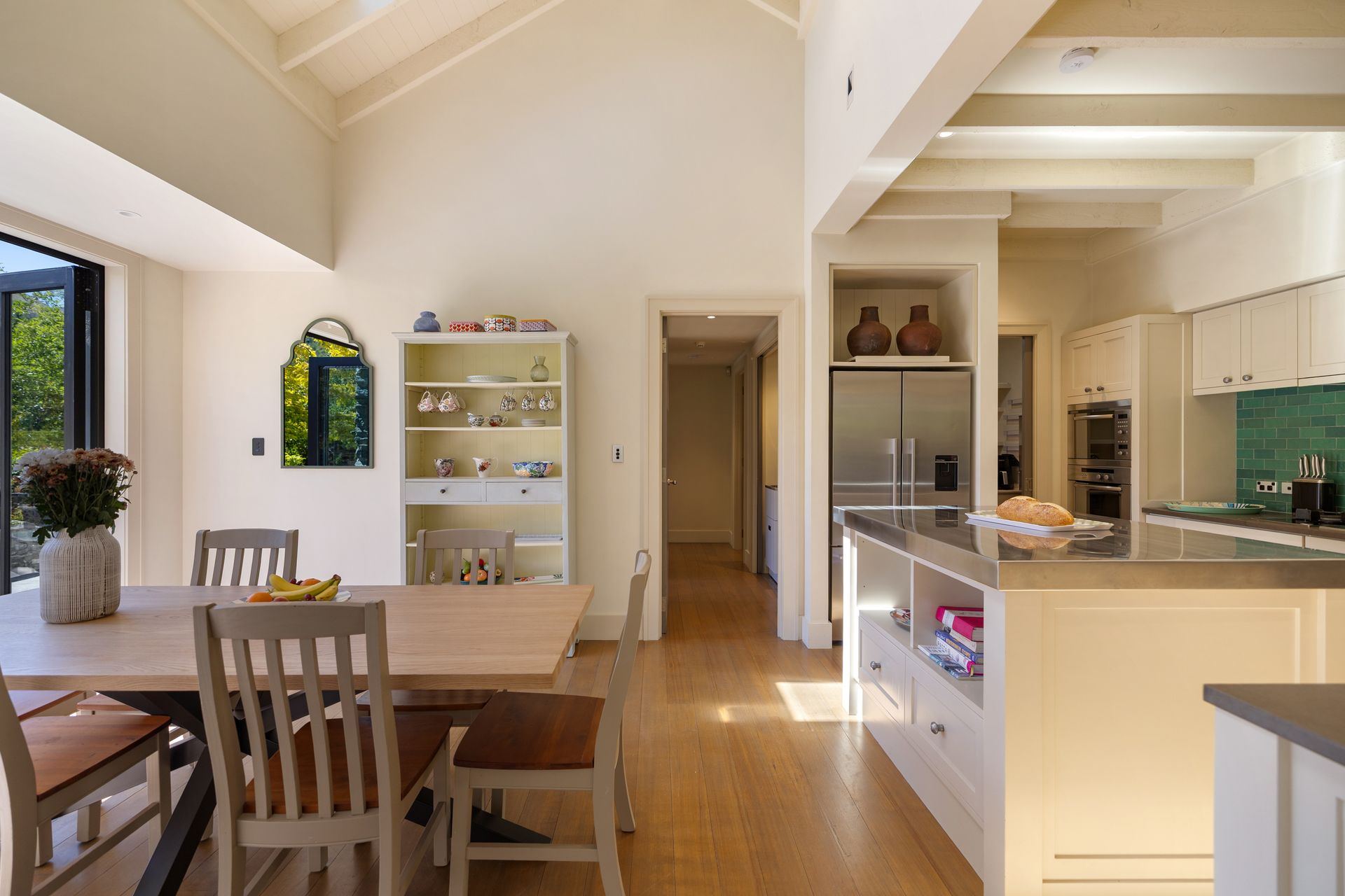 The main living area features open-plan kitchen, dining, and lounge spaces with high ceilings, a statement stone fireplace, and excellent indoor-outdoor flow to a sunny patio ideal for entertaining. The designer kitchen is well equipped for group dining and longer stays.