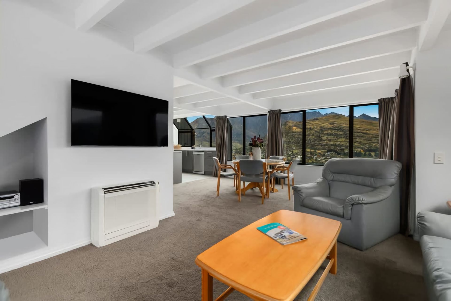 The well-equipped kitchen awaits your culinary adventures, blending practicality with modern flair for an enjoyable cooking experience. The living area is open plan with the kitchen, dining and living space intertwining and showcasing the sought-after outlooks of Queenstown.